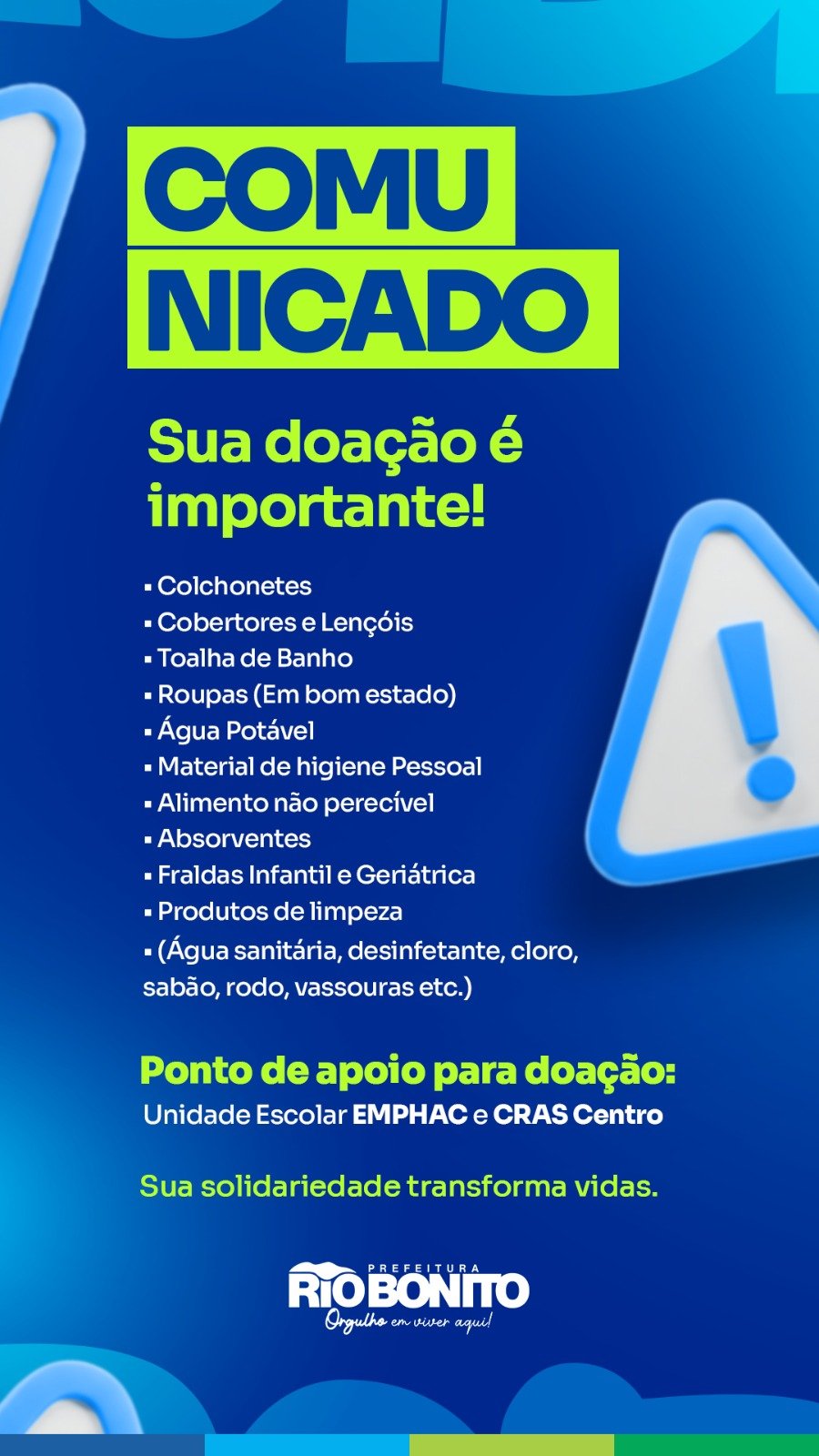 A prefeitura de Rio Bonito organizou uma campanha para arrecadar donativos que serão destinados às famílias que vêm sofrendo com os efeitos das chuvas que atingiram Rio Bonito nesta semana. Foram abertos dois pontos para entrega de donativos que funcionarão diariamente no Centro de Referência e Assistência Social (CRAS) do Centro, e no Escola Municipal Professor Honesto de Almeida Carvalho (EMPHAC), na Magueirinha. Entre os itens para doação, estão roupas, água potável, Fraudas infantil e geriátrica, alimentos não perecíveis, lençóis, toalhas, materiais de higiene pessoal (sabonete, papel higiênico, escova, fio dental, creme dental) materiais de limpeza (cloro, água sanitária, desinfetante, sabão, rodo, vassoura), colchões, alimentos não perecíveis, entre outros.