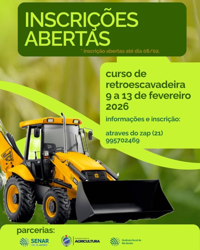 A prefeitura de Rio Bonito abriu inscrição para o curso gratuito de Operador de Retroescavadeira, realizado pela secretaria de Agricultura, em parceria com o Serviço