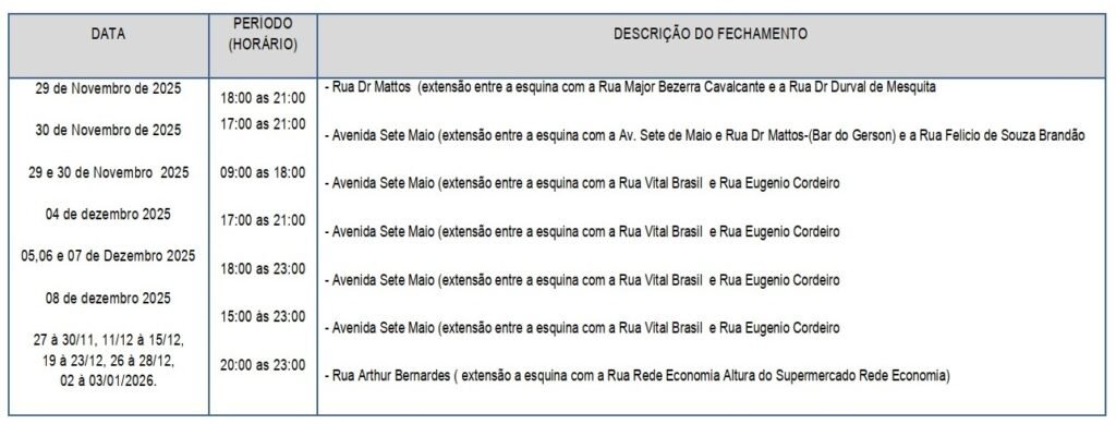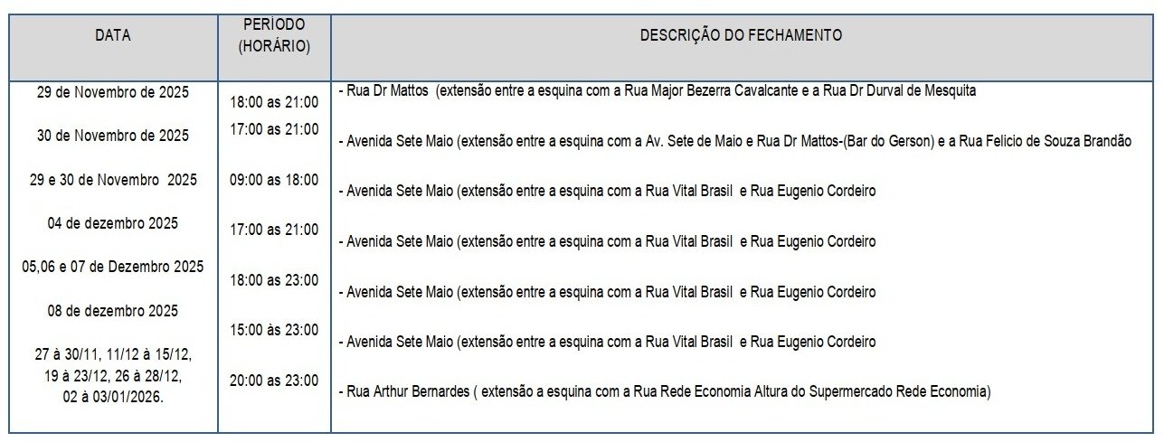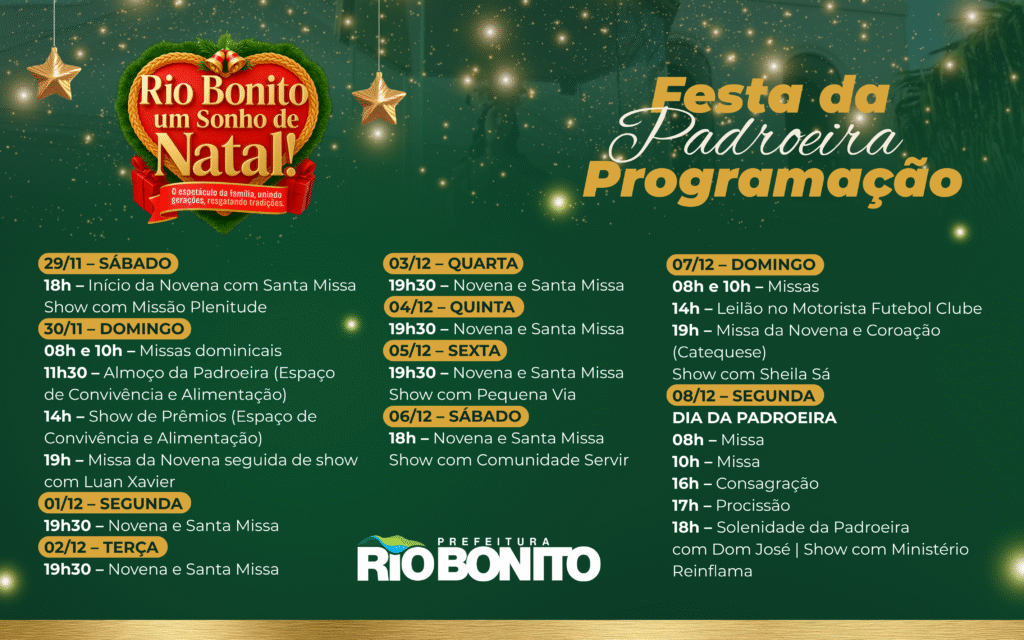 Fechamento das Ruas – Durante a programação dos festejos na cidade, algumas ruas serão interditadas e outras terão inversão do sentido da via, como a Rua Desembargador Itabaiana de Oliveira, compreendendo entre a esquina da Rua XV de Novembro e a Rua Presidente Arthur Bernardes, para a realização de teste no prazo de 15 dias. Durante o “Rio Bonito, um sonho de Natal”, no dias 26 de novembro a 6 de janeiro de 2026. Durante as comemorações da Festa da Padroeira, realizado pela paróquia de Nossa Senhora da Conceição, nos dias 29 de novembro a 8 de dezembro, e na realização do “Acender das Luzes de Natal” da igreja Batista Betânia no dia 30 de novembro, e o “Acender das Luzes de Natal” da Primeira Igreja Batista, no dia 29 de novembro, serão interditadas o tráfego de veículos em várias ruas. Confira a relação das ruas interditadas abaixo: